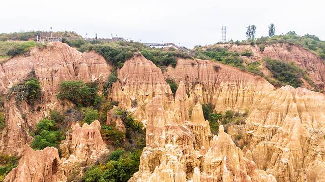 走进这大自然雕塑的艺术魔宫,沿着崎岖的小路在土林中漫游,你可以钻进深不可测的洞穴一探究竟,也可以直抵幽暗狭窄的谷底窥探一番,还可以登上巍峨险峻的高峰将土林的全貌尽收眼底。