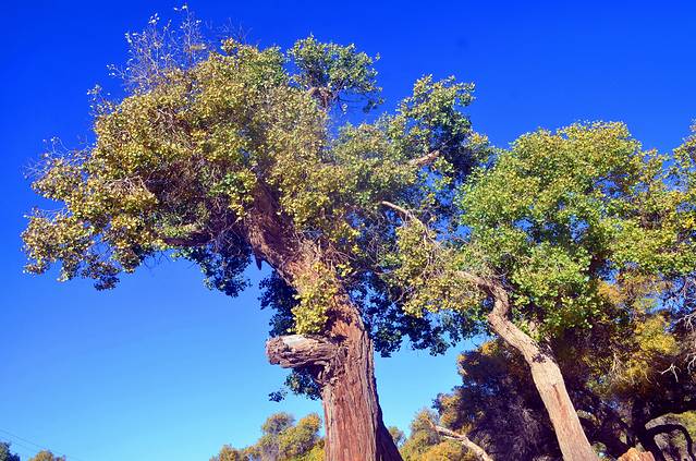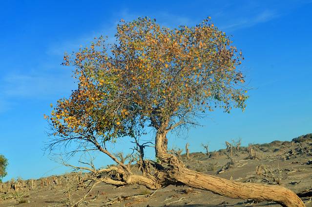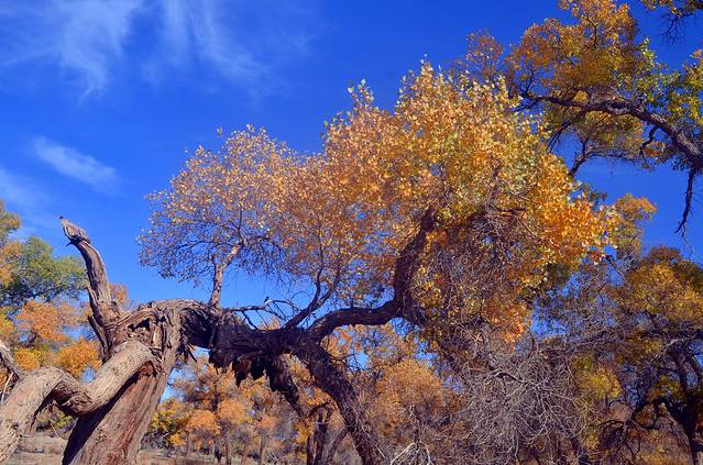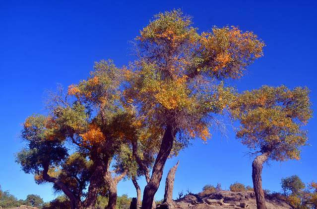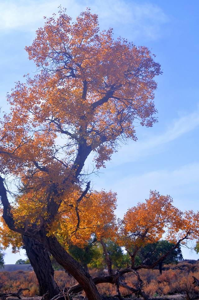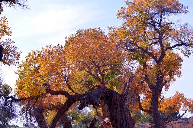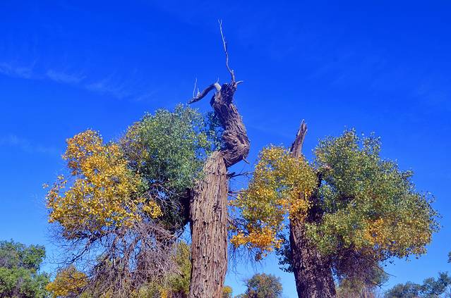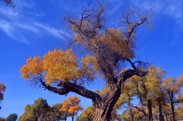 胡杨还是一个神奇的树种,它的生长总是和凤凰与鲜血紧密相连;胡杨还是一个多变的树种,它春夏为绿色,到了深秋就变成了黄色,而到了冬天则变成了红色。