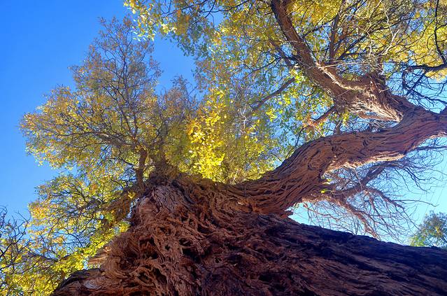 胡杨蒙古语称为“陶来”,是落叶中型天然乔木,高10~20米,树干通直,树叶奇特,生长在幼树嫩枝上的叶片狭长如柳,大树老枝条上的叶却圆润如杨,叶子边缘还有很多缺口,又有点像枫叶,故它又有“变叶杨”“异叶杨”之称。