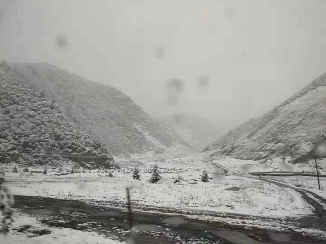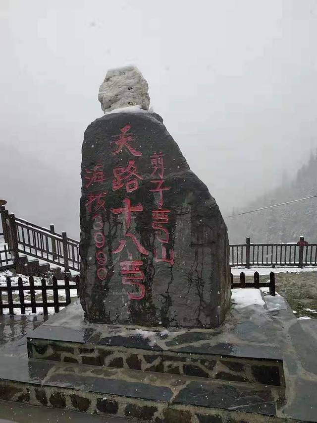 进到折多山天气继续阴沉。顺着路往上盘,雾气开始变浓能见度很低。更悲催的是盘到半山腰发现对面来车的车头上顶着雪,果然行驶一段距离后天上开始飘雪花了,小伙伴们都一脸懵我们从来没见过九月份下雪的这违背了我们的认知!随着海拔的升高雪也越下越大,到了折多山垭口已经成了鹅毛大雪。还没进西藏先给了我们一个下马威!