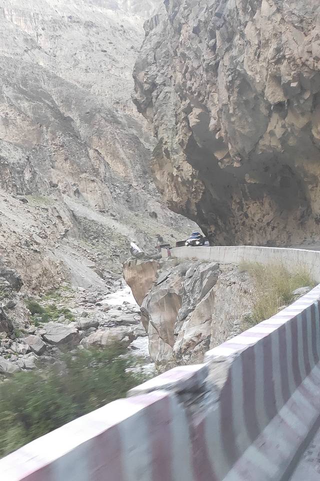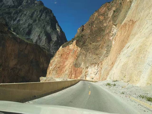 从稻城到奔子栏这段路景色极美!也没什么车。不过有一大段丹霞地貌的区域路比较险,这段路是开凿山壁修建的,一面是陡峭的石头山壁,一面是湍流不息的江水。丹霞地貌没有什么植物覆盖就是光光秃秃的大石头经常有落石出现。这段路我们是由经验最丰富的老司机H哥开道,后车保持车距快速通过的,算是有惊无险!(M总给团队配的手台,在这次行程里起了关键作用!前车能及时将路况报于后车,两辆车上的小伙伴能够及时沟通,提高了行车的安全性!)