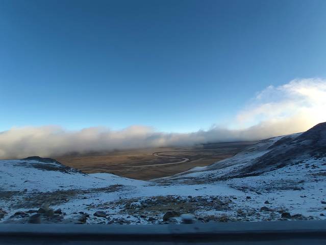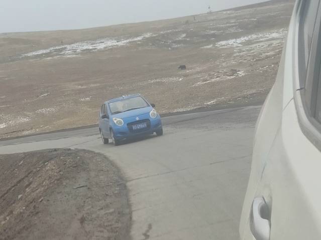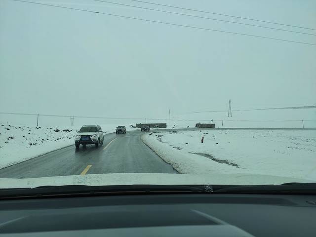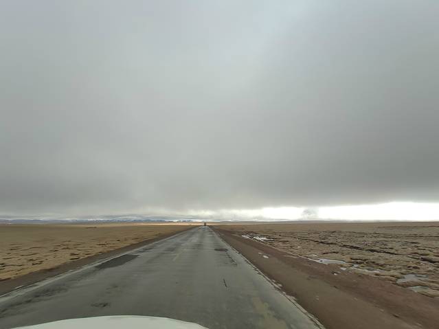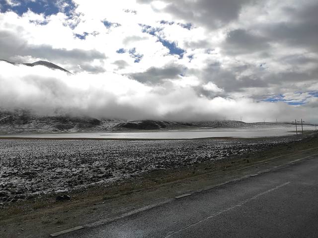 一早出发,我们向着今天的第一个挑战唐古拉山前进!开始的路一马平川相当好走,我们都在想着如果都是这样的路况830公里也不算什么!可好景不长,在接近唐古拉山山脚时路开始出现坑洼起伏。从这里开始后面的路基本都是大坑套小坑车速根本提不起来!(后来查资料这种路面的形成是因为这里处于高海拔常年冷热变化频繁,路基冻了化化了冻,才使路基松塌。前面也提过青藏线是西藏的补给线,大车多更是把路面轧得坑坑洼洼!)同时两场雪夹杂着小冰雹也让我们体会了一下什么叫高原极端天气!