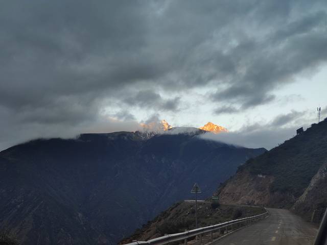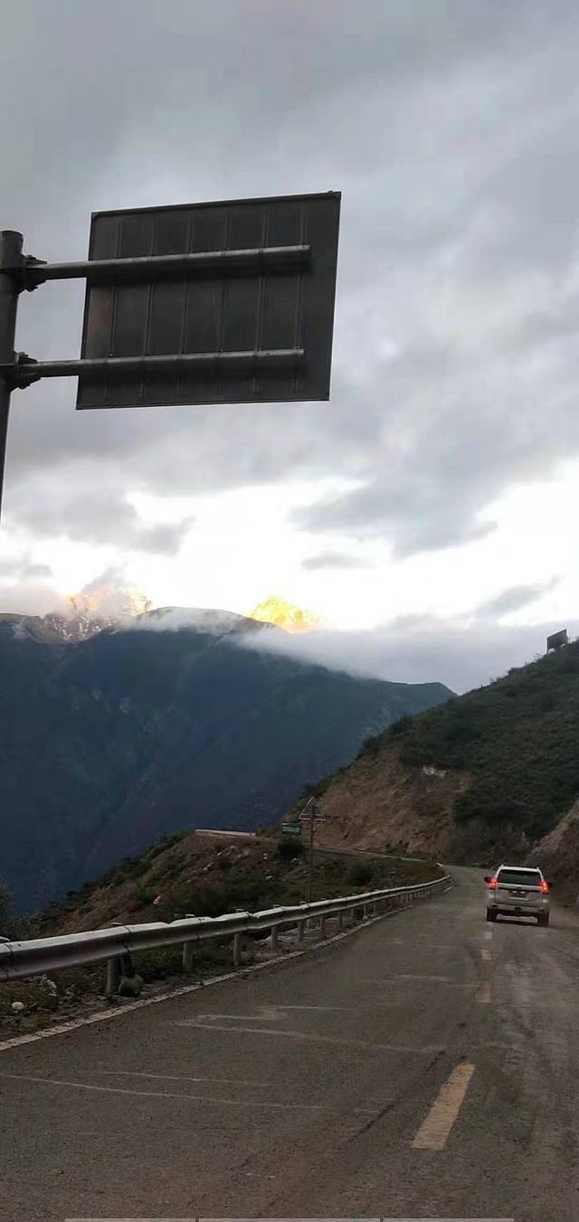 一早出发,行不多久我们就看到了“日照金山”。这真是奇美的景色,阳光照射在山巅反射出金色的光芒。没有任何准备我们就这样不期而遇了,日照金山,见者吉祥!我们真是幸运!