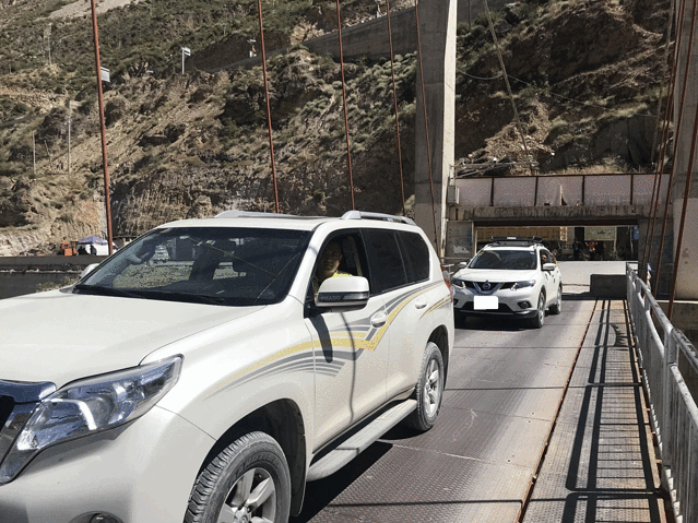 临到中午的时候我们到达了奔子栏。进镇前要通过一座简陋的铁桥,铁桥只能单向行驶,据说这座桥还是一座界桥,桥的一边是四川一边是云南。