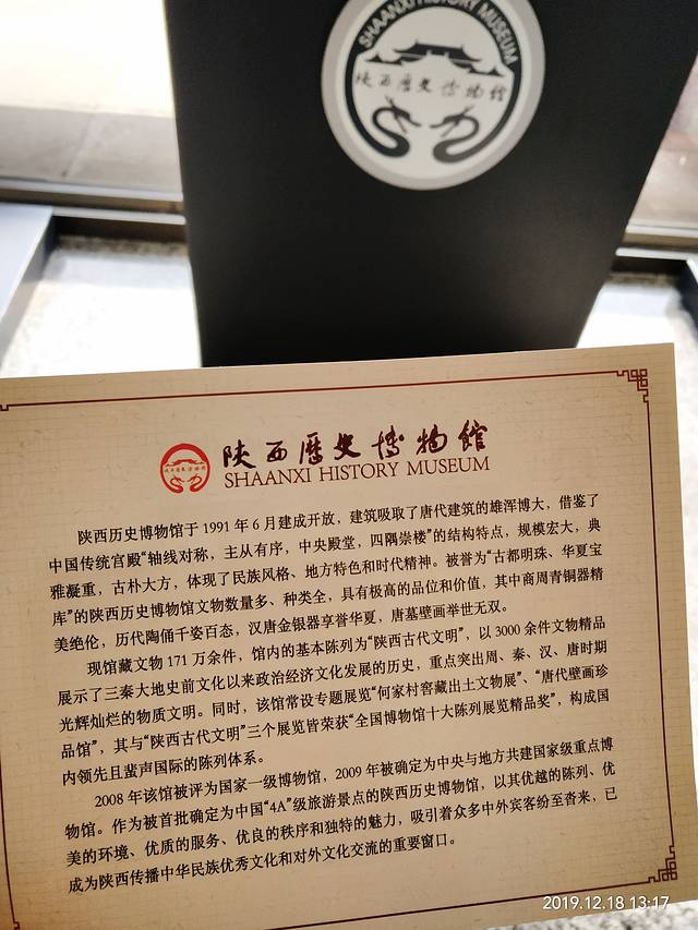 陕西历史博物馆免费门票,需要提前在网上预约,冬天淡季倒是好约。馆内有七个展厅,只有三个是免费的,展现春秋开始到明清的历史文物,主要分为汉,秦,唐三大篇章。镇馆之宝若干,但有些并不在展柜里,因为需要拿去维护。文物参观其实也是见仁见智的事儿。都在于各人喜好。三个馆浏览下来大概花费三四小时。可以自己下载旅游讲解的app,也可以在博物馆请讲解导游。千万不要走马观花,因为好多东西是需要讲解的。