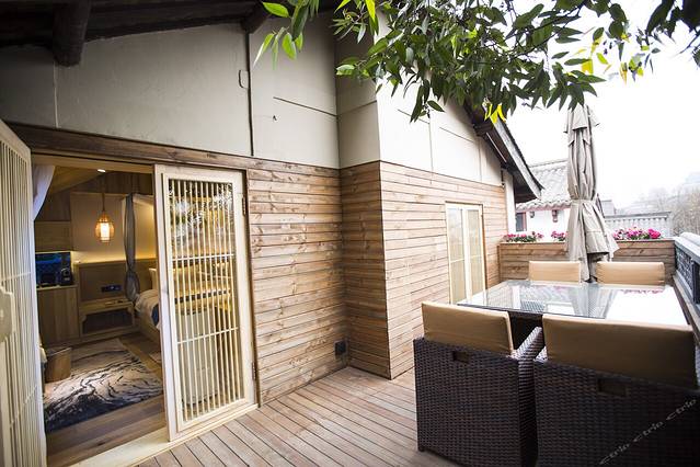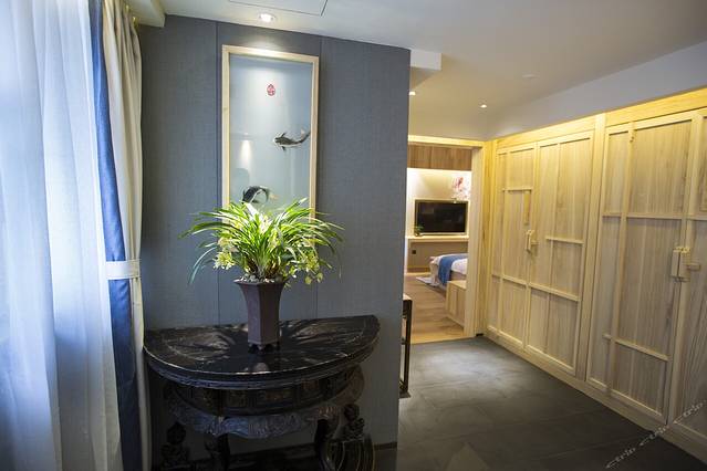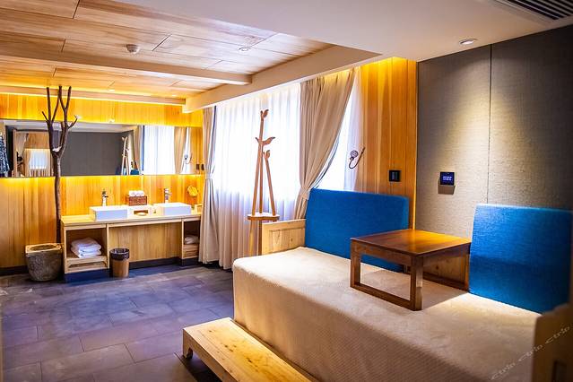 整个酒店运用大量的原木色,一花一叶,一石一木,灯光与摆设的结合,都透露着中式的禅意。房间内有一个半圆桌,据说是旧时候当屋里男主人外出,留下的女眷只会用半个桌子吃饭,直到男主人归来另一半才会搬上来凑成一个圆。这另外一个半圆就在楼下入门处,一上一下,两两相望,琴瑟和鸣。