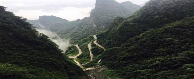 张家界天门山景区正门云雾缭绕,宛如仙境。