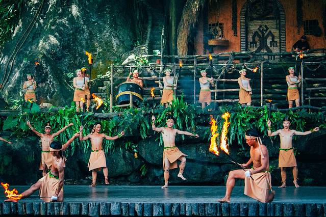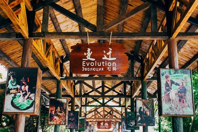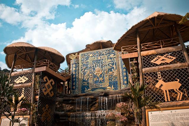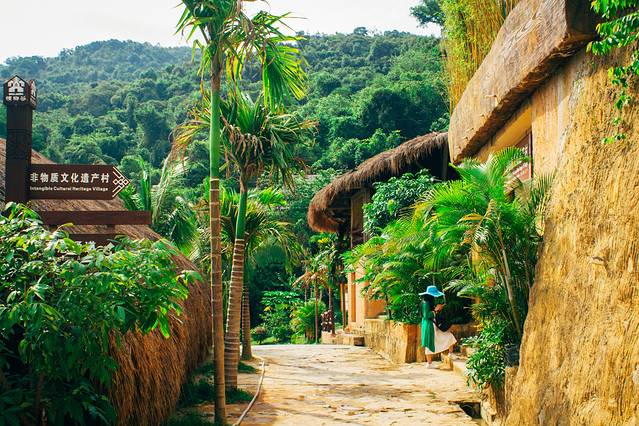 槟榔谷是黎苗文化旅游区,景区由非遗村、甘什黎村、谷银苗家、田野黎家、《槟榔·古韵》大型实景演出、兰花小木屋、黎苗风味美食街七大文化体验区构成。景区的大门做的特别有意思,色调,形状以及人们穿的服饰,觉得很有故事。事实也正是如此,建议大家雇一个解说员,可以听到很多关于槟榔谷的传故事以及见到深受这种传统文化洗礼的妇女们。