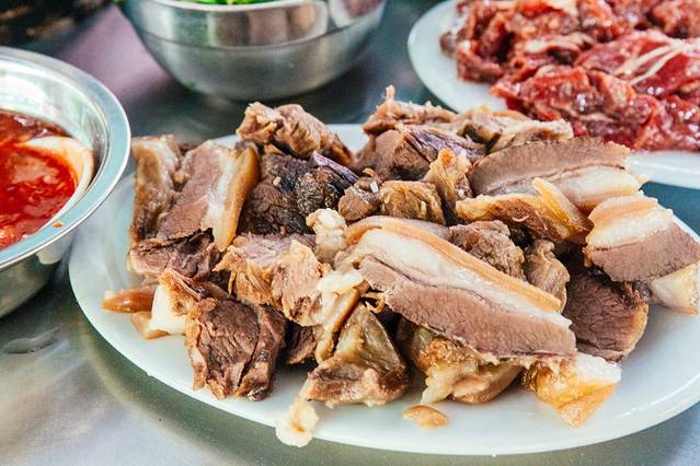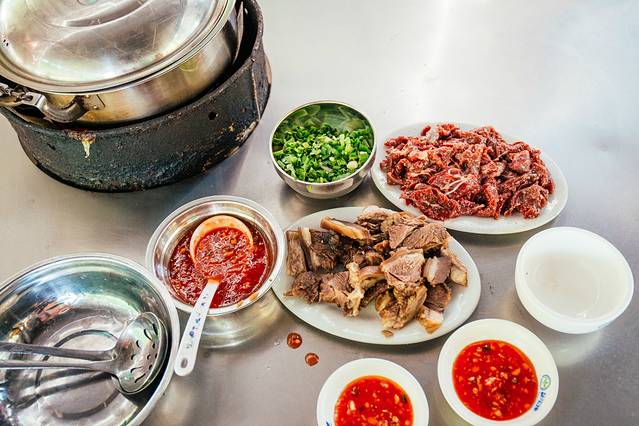 刚坐下,会先上一锅羊肉清汤,炉子里面是现放的木炭,对比现在清一色的煤气罐来说非常讲究了!等汤煮沸,秘制羊肉就上桌了。我们根据网上的推荐点了一盘白切羊肉,一盘生羊肉片,还会附赠一盆子青菜以及调味料,两个人吃份量刚刚好。
