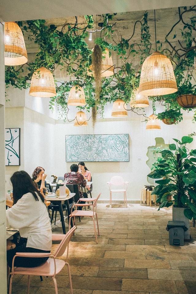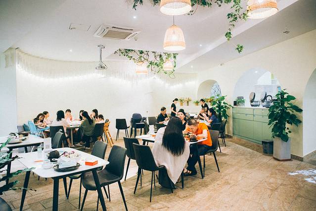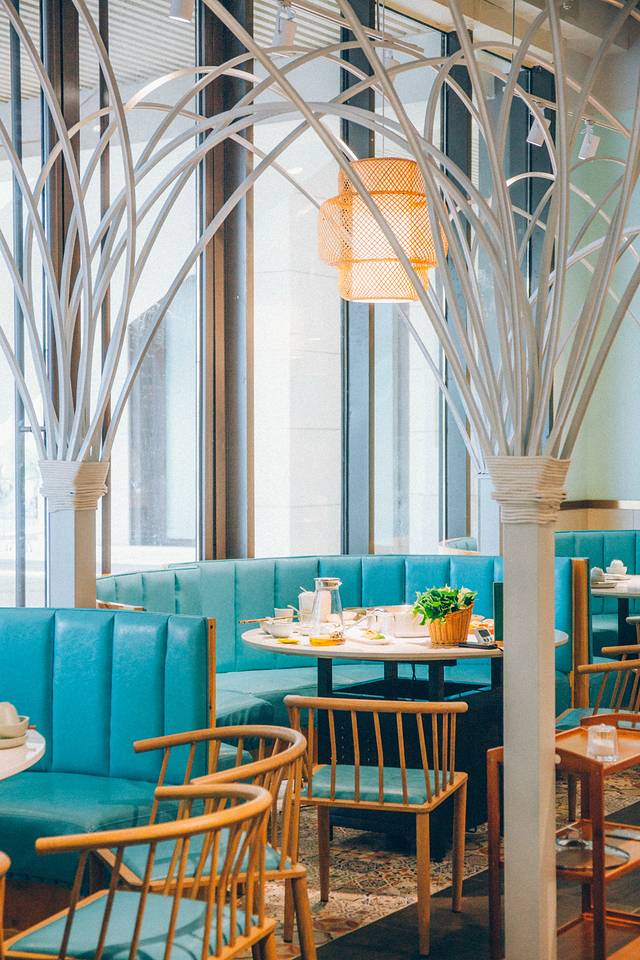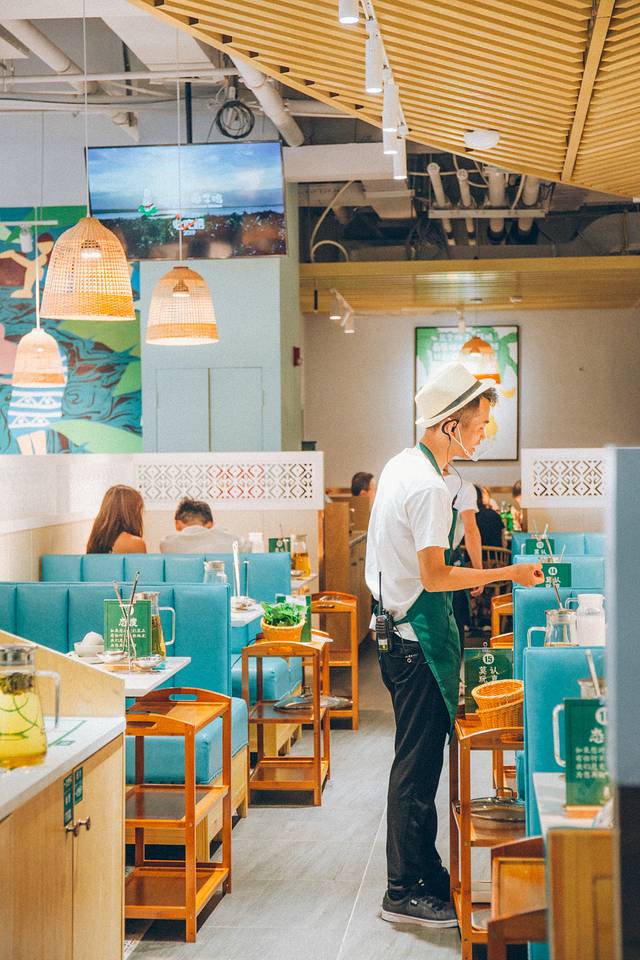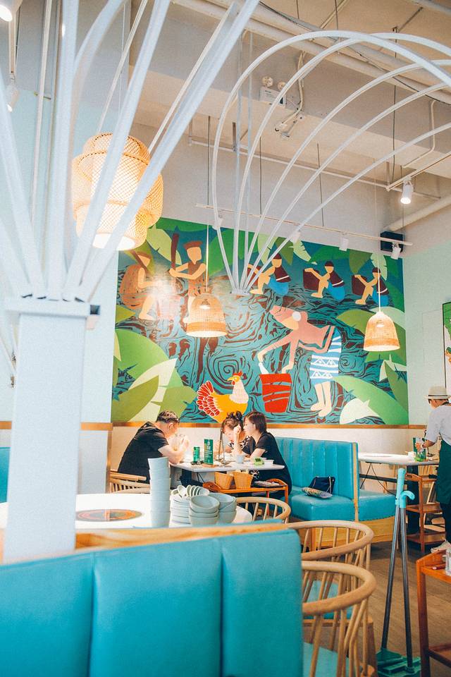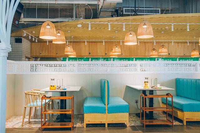 嗲嗲椰子鸡的整体装修风格是我喜欢的类型,明亮的天蓝色卡座搭配白墙和原木家具,再加上墙上富有趣味性的手绘,轻时尚、轻简约,让整个就餐氛围立马变得愉悦起来。
