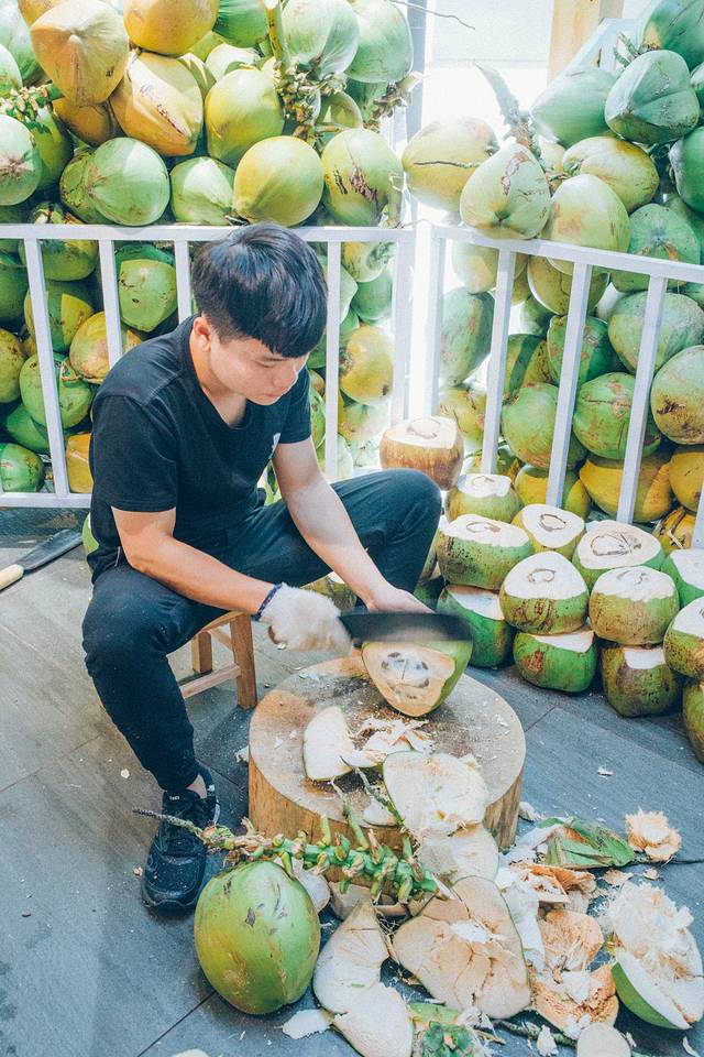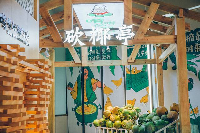 刚进店,右侧是砍椰亭,堆放着数不清的椰子,只见一位小哥一刻不停歇的在砍椰子,传闻中的三个椰子一只鸡,今天算是见识到了。