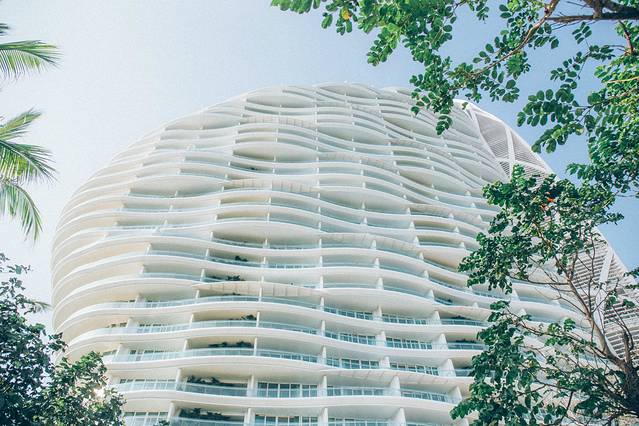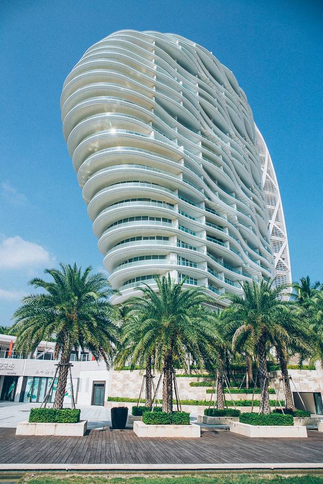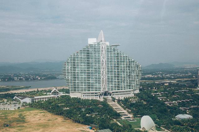酒店的主楼帆船造型大气、优雅,时尚的流线造型,是由 英国 著名设计公司阿特 金斯 打造。可以说是整个 海棠湾 的地标建筑,特别是到晚上灯光秀的时候,犹如一个巨大的彩色风帆,非常壮观!