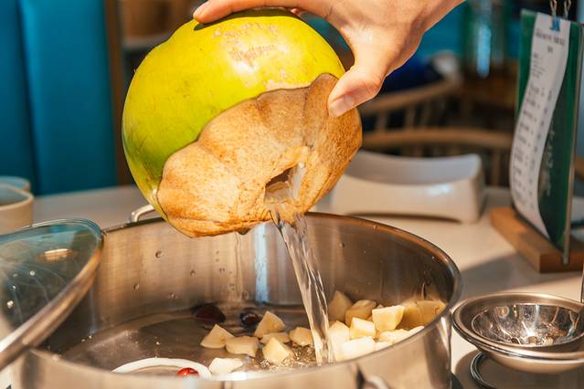 嗲嗲的椰子鸡是将 文昌 鸡与3个椰子、一瓶 法国 依云 水、木瓜、竹笙、红枣、马蹄、椰肉等一起烹煮,保证食材的原汁原味、绿色天然,完全符合现在人们对美味的需求。