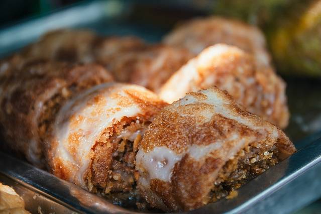 椰蓉卷,糯米包裹着糖姜炒椰丝和花生等配料,皮软馅香。