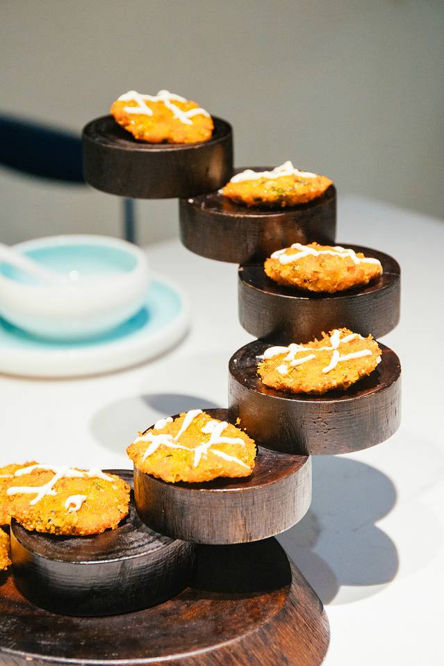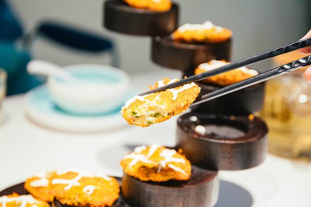 下面这道【墨鱼饼】,一块鱼饼一个小圆墩,装盘很精致。