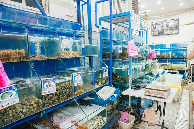 想自己买海鲜,可以去旁边的海鲜市场采购完来小胡子加工;要是怕麻烦,可以直接在店内选购加工,两者皆可。店内的海鲜都是明码标价,非常透明,记录一下价格再去第一市场对比,至少不会被宰。我们为了图省事,决定在小胡子选购再加工。