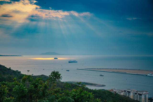 南方的天气说来奇怪,右边的凤凰岛被云层笼罩在迷雾里,左边的景象却是截然相反。