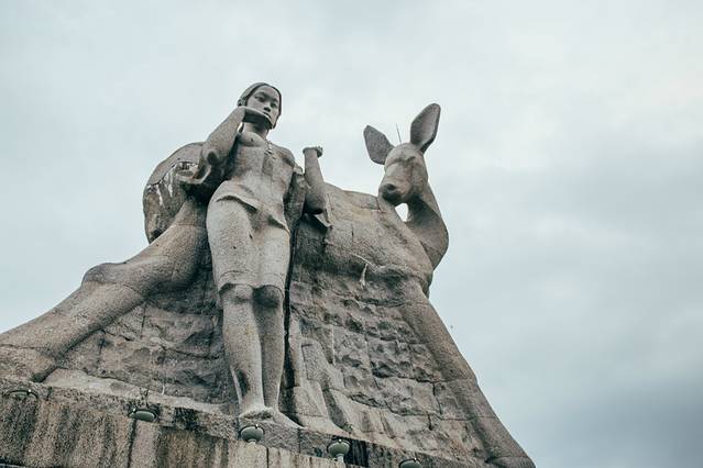 鹿回头有一个 海南 黎族美丽的爱情传说:古代一位英俊的黎族青年猎手,头束红巾,手持弓箭,从五指山翻越九十九座山,涉过九十九条河,紧紧追赶着一只坡鹿来到 南海 之滨。前面山崖之下便是无路可走的茫茫大海,那只坡鹿突然停步,站在山崖处回过头来,鹿的目光清澈而美丽,凄艳而动情,青年猎手正准备张弓搭箭的手木然放下。忽见火光一闪,烟雾腾空,坡鹿回过头变成一位美丽的黎族少女,两人遂相爱结为夫妻并定居下来,此山因而被称为“鹿回头”。根据这个美丽爱情传说而建造的 海南 全岛最高雕塑“鹿回头”已成为 三亚 的城雕, 三亚 市也因此得名“鹿城”。