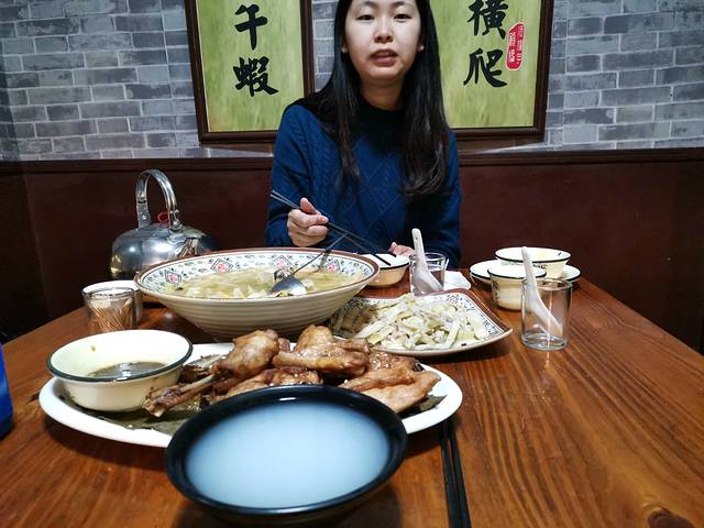 店家送了一碗米酒,好好喝,刚好有点小感冒。吃饭偶遇隔壁桌,常熟老乡,热情推荐我们三鲜疙瘩汤,我们自己点的荷叶鸡也意外的好吃,可能是饿了。老乡说他们要参加暮鼓晨钟跨年活动,太冷,我们放弃了。
