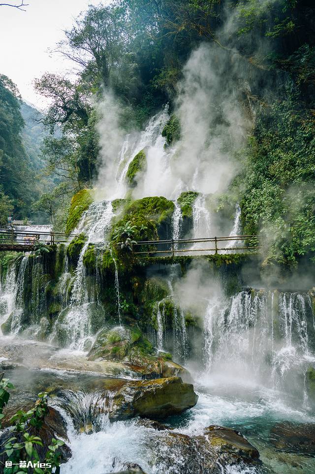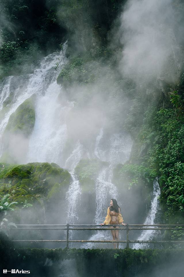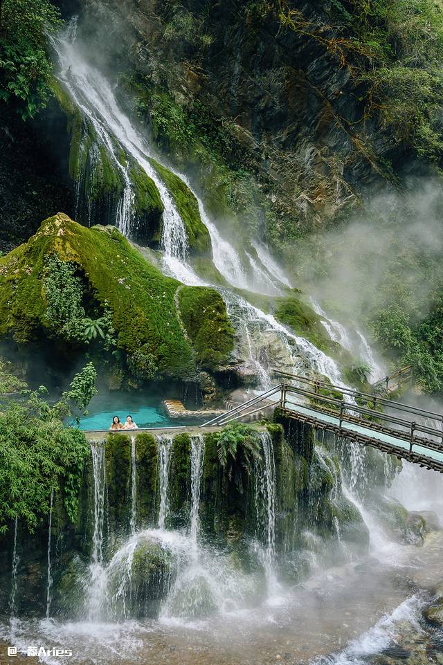 走进它,40多度的温泉水从半山的悬崖上飞泻而下,水流浩荡中是大自然最原始的粗旷之美。