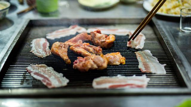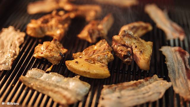 上网烤,不出3分钟五花肉就缩卷到一起,开始滋滋作响,这销魂的声音让人愉悦,一般等到猪肉烤至金黄焦香时,就可以吃啦!
