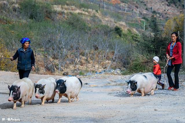 这些在野外生活的跑地小黑猪,吃的是杂粮,喝的是山泉,和我们在路上遇见的另一群圆润肥胖的家猪相比,大凉山小黑猪简直就是猪界健美选手!哈哈。