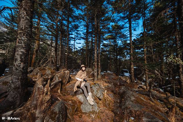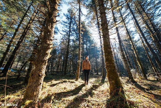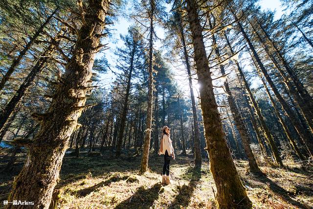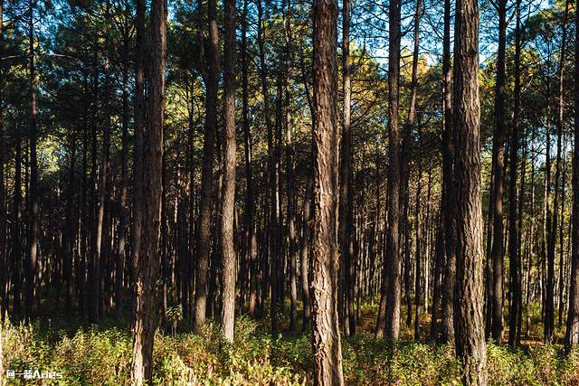抵达景区前,沿途风景宜人,偶然路过一大片原始松林,光影斑驳中,密林深处异常好看。