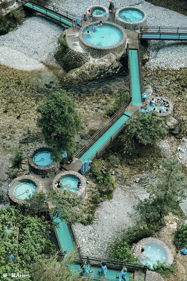景区河滩中心,人工修建的圆形温泉池星罗棋布,这里的水池一半冷,一半热,如冰火两重天,所以夏季也非常适合到这里来泡汤呢!