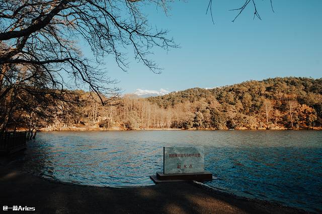 阳光下水面闪耀着星光点点的波光,岸边亦是光阴斑斓,海子边那些不知年代的老树,压低身姿向湖面伸展,仿佛断桥独引,钓台凌空!