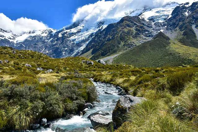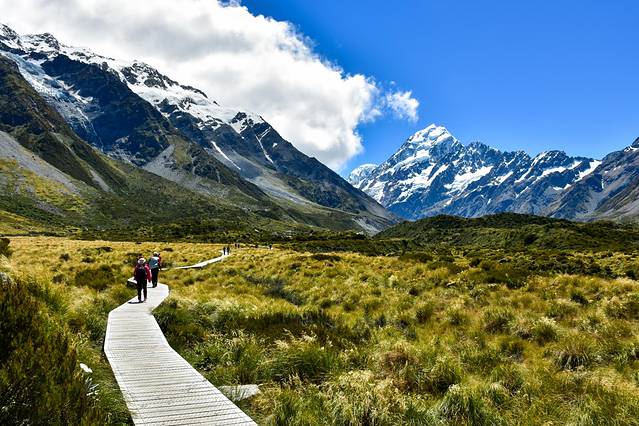 这个季节去Mt Cook也是可以看到冰川的。Mt Cook有大量的登山步道,可以根据自己的体力或者时间来妥善安排,路牌非常人性化,你也可以从景区导览得知哪条线路的难度是多少,哪条线路有什么景观,以及建议时长。每个路牌都会指出离下一个点大概还需要多长时间的徒步。可以说,无论对于家庭休闲,或是徒步发烧友,都能找到适合自己且满意的徒步线路了。
