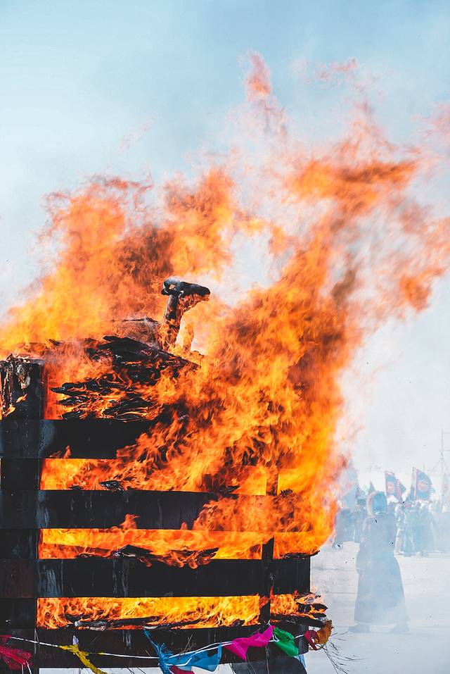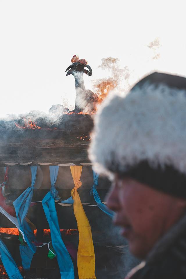 紧接着是祭火仪式,在木堆的顶端有祭司有的猪、羊。