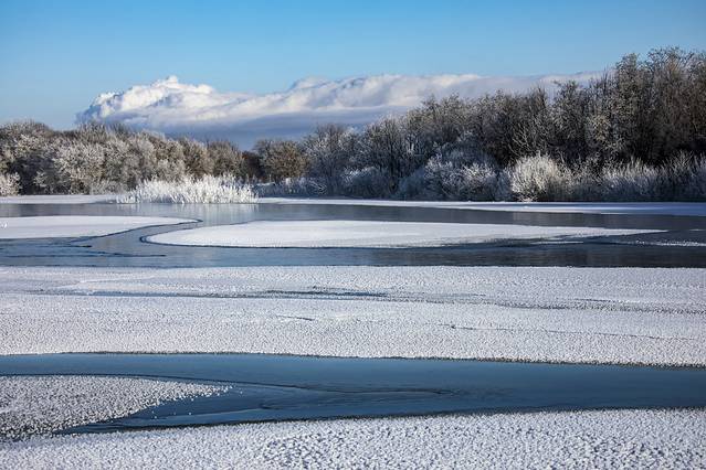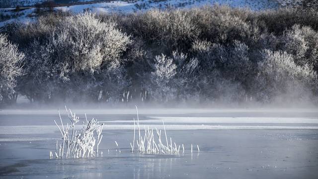 水中还长着青青的水草,河面上云蒸霞蔚,河岸边雾凇晶莹,虽然今天没有绚丽的日出,但哪怕给它一丝光,也能把它点亮。