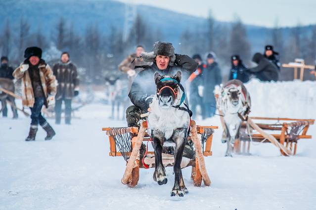 活动现场的驯鹿比赛也是我们从来没见过的。驯鹿胆子很小,有一只甚至将主人从鹿车上翻了下来,飞奔出场地,主人跟在后面狂追,引得现场观众大笑不已。