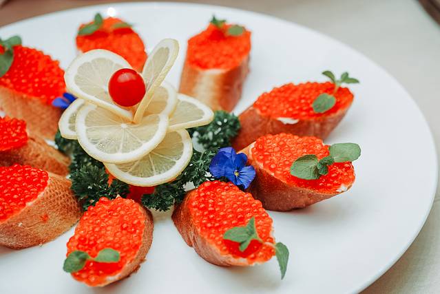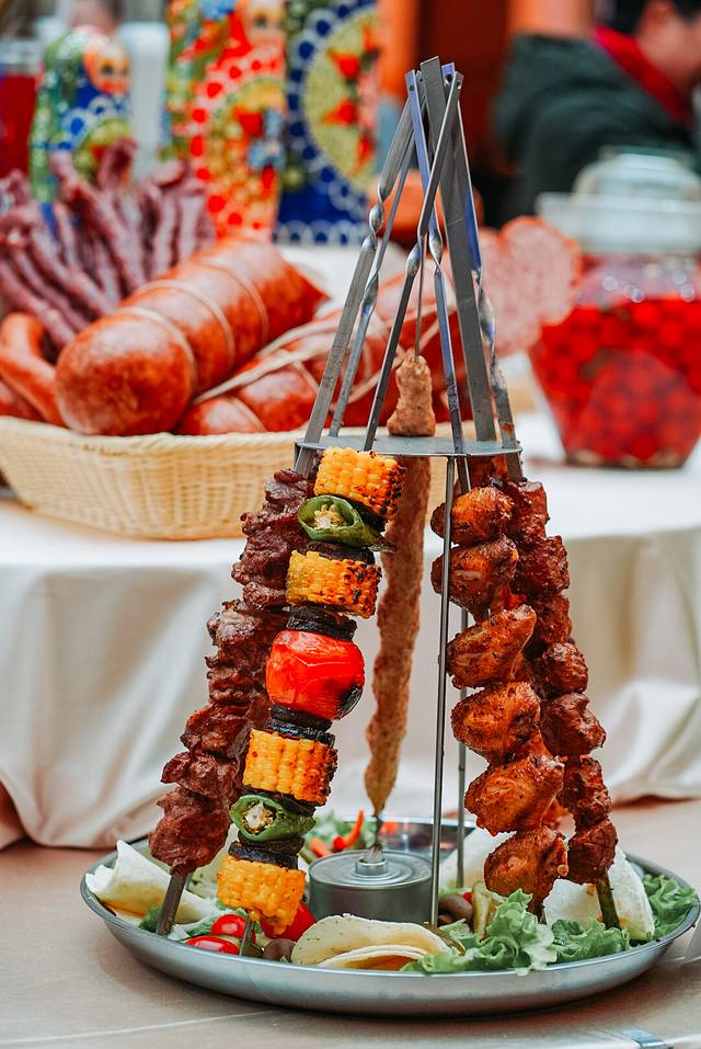 俄罗斯原始炭烤大串拼盘:有蒜肉、熏鱼、鱼子酱组合。蒜肉是经过俄罗斯大厨不经过任何香料以及添加剂,用最传统的手法制作,细腻软嫩,俄罗斯顶级马哈鱼,为人提供需要的营养,味道极其鲜美,是战斗民族必吃的肉拼盘。