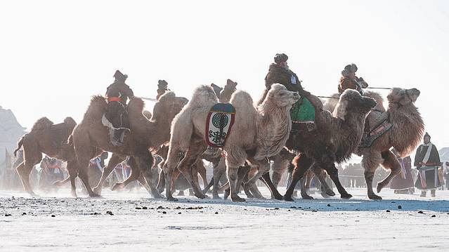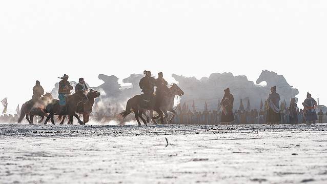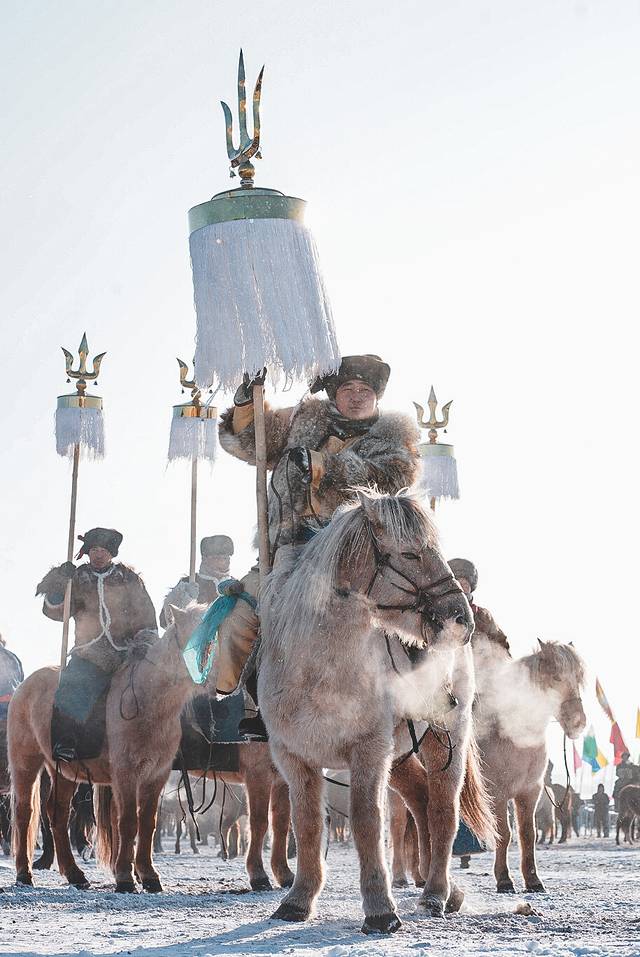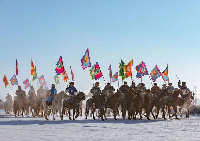 在今年的冬季那达慕的现场,有来自蒙古族各部落、鄂温克族、鄂伦春族、达斡尔族、俄罗斯族等42个少数民族的民众,以及400匹马、200峰骆驼和近1700名演员参加。