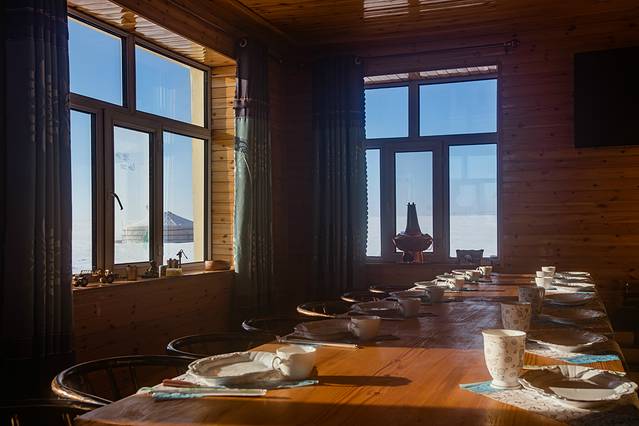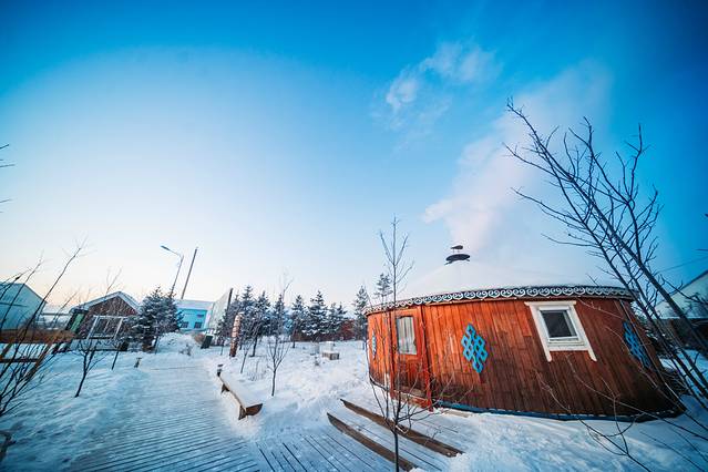 天黑前我们赶回了根河市区,入住了根河根林木屋宾馆。这里的房间都是一间间的小木屋,在冰天雪地里仿佛置身于北欧。唯独有一间木质的蒙古包,想着来蒙古还没住过蒙古包,我们毫不犹豫就选择了它。