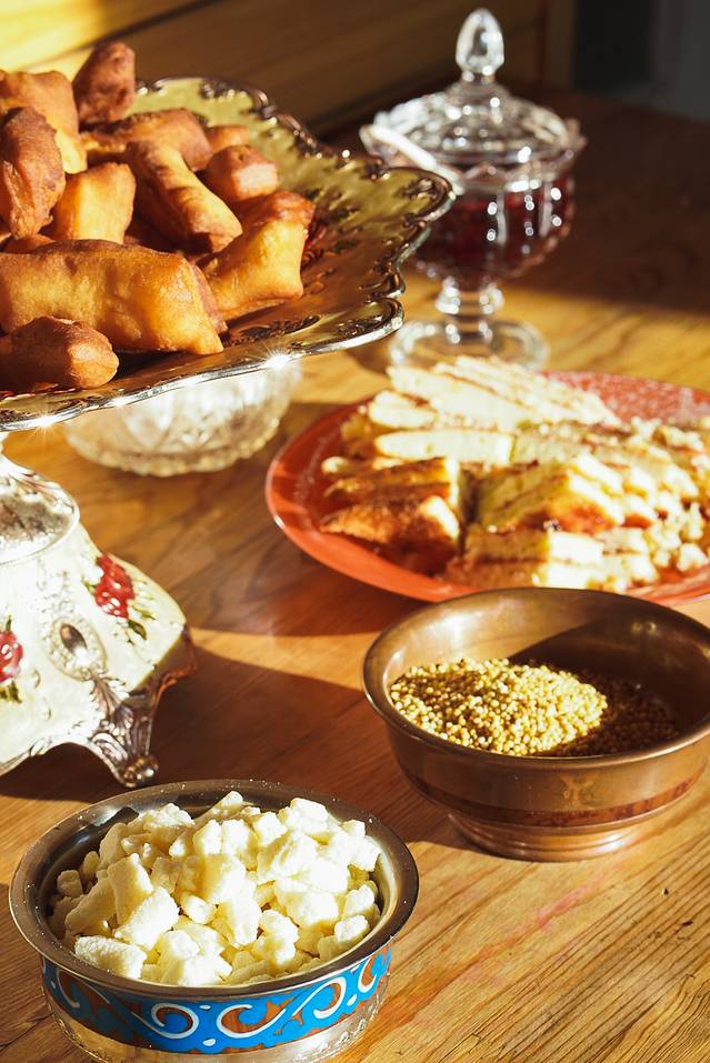 温暖的小屋内准备有内蒙古特色的点心,炸油果、奶酪、面包等等。