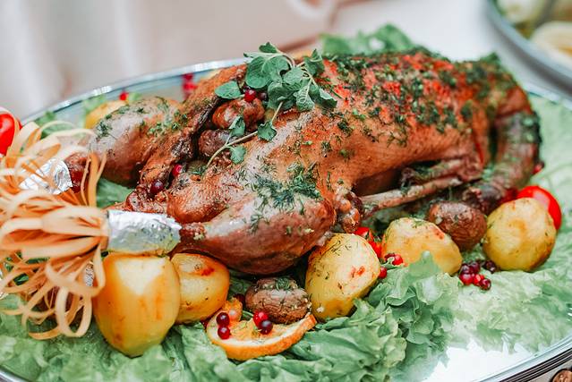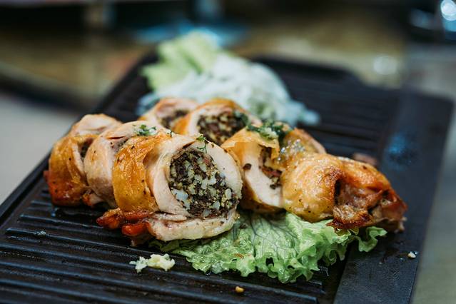 蘑菇让鸡腿,由鸡肉、蘑菇、茴香、黄油,放入烤箱烤制而成。“让”是放馅的意思。