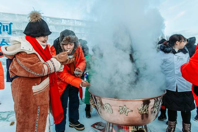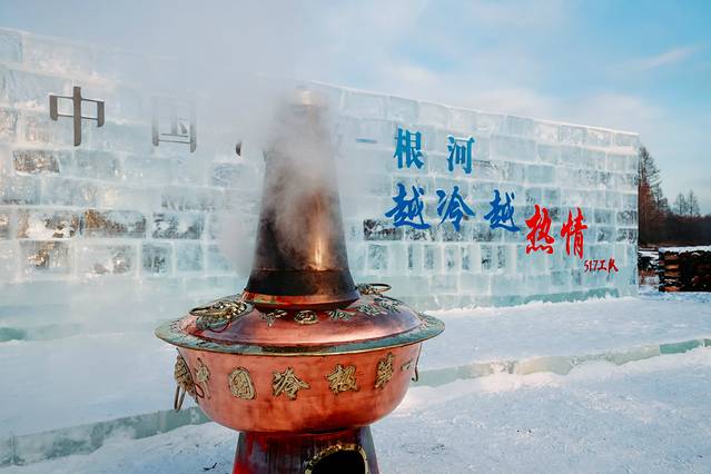 在冷极品尝千人火锅是怎样一种感受。这里的背景板都是用冰块做成的,大家围着热气腾腾的炉子涮着内蒙古羊肉,即使没有蘸料也有滋有味。