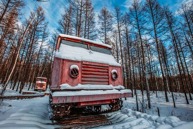 夕阳下的大兴安岭,冰封雪飘,一尘不染。在517森工队,我们看到了曾经在这里工作生活的伐木工人留下的载具和工具。
