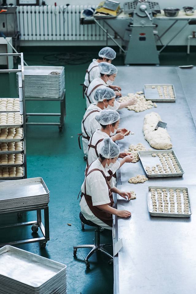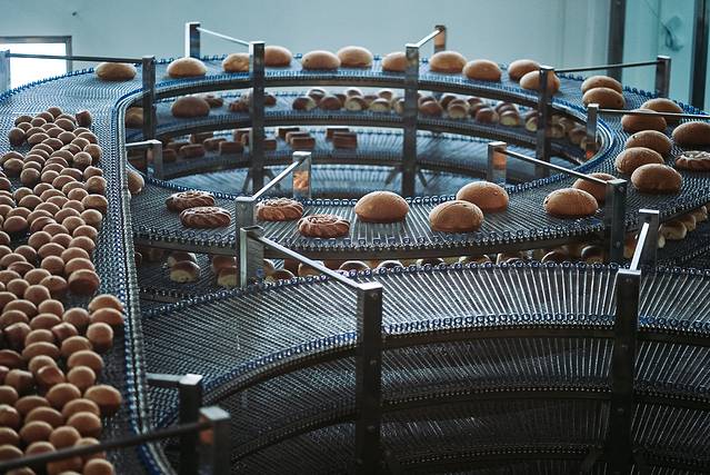 将醒发好的列巴入炉烤制。有最原始的土炉、烤箱和隧道炉三种。将烤制好的列巴脱模后放到传送带上,直接传送到晾晒塔上。晾晒区是无菌区,每6分钟转一圈,列巴2小时后转下塔。