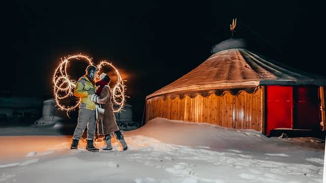 晚上我们去外面玩了会儿光绘,顺便感受一下室外的温度。雪大概有5、6公分深,带上口罩哈出的气瞬间就在睫毛上结了冰,如果不带手套5秒,手就会冻得生疼。拍了几张以后我们就赶紧回屋了,在这么冷的天气里,不冻河是怎样一番景象,我们更加期待了。