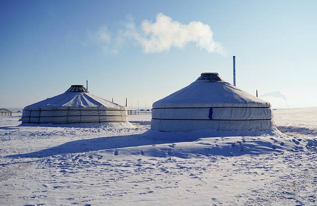 车开了三个多小时,一望无际的鄂温克雪原出现了蒙古包的踪影,这些是布里亚特游牧人家。