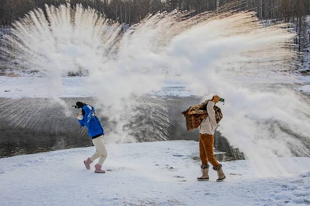 4.可以借助道具,图二的泼水成冰是用保本杯泼的开水,一定要够热才会马上成雾,泼的时候注意安全;