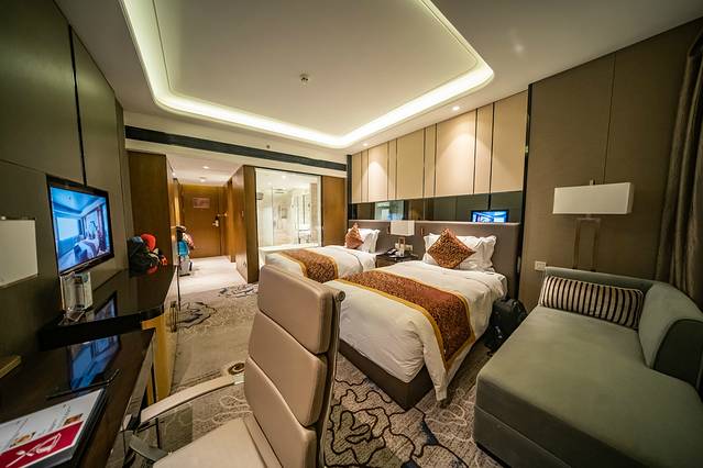 房间宽敞舒适,地上全部铺有地毯,绝对是星级标准。有免费wifi、中央空调、隔音效果很好。床品也是柔软干净,睡眠质量能很好的保证。