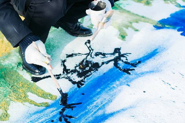 雪地作画可比在纸上作画难得多。墨水都是用开水兑的,但是即使这样笔尖也很快就会结冰,旁边还得时刻准备一个保温壶。零下三十度的极寒天气,对于作画人的身体,特别是手,也是极大的挑战。