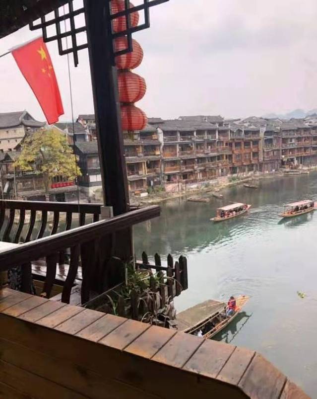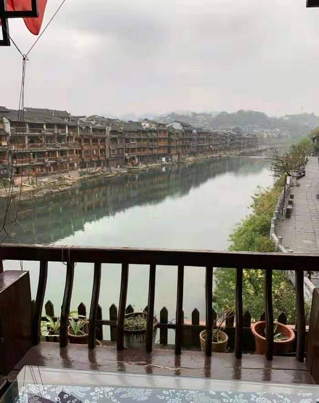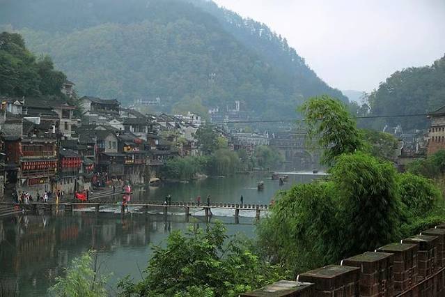 从河边的旅馆阳台眺望凤凰古城。碧绿的江水从古 城墙 下蜿蜒而过,叠翠的 南华山 麓倒映江心,两边是有着明清建筑特点的飞檐粉壁,古老的吊脚楼、 临江 的亭台、清澈的江水还有那连接两岸的廊桥,犹如一幅浓墨浅彩的中国山水画。