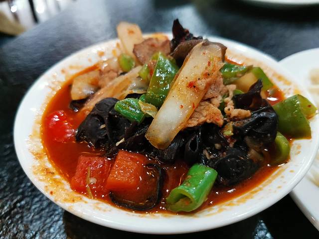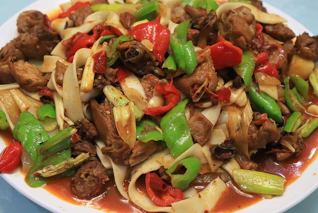 大盘鸡:主要用料为鸡块和土豆块、四川粉皮和青红辣椒等。新疆大盘鸡通常是先炒后炖,皮焦肉烂的鲜美鸡块夹杂着青椒、红椒鲜亮的色彩,混合在汤汁中的土豆淀粉吸收了油腻。一定要配上宽面食用,主食和菜浑然一体。