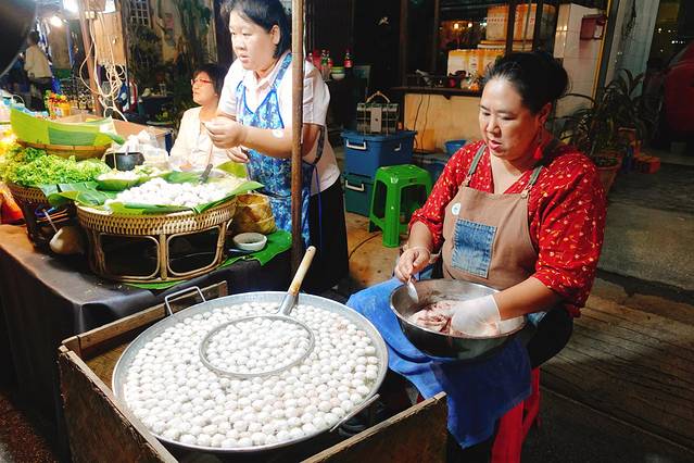 这家摊位就在老奶奶的清迈香肠旁边,这个猪肉丸摊位则是由三个老奶奶共同打理的,分工明确,一个负责现场做肉丸,一个负责煮肉丸,一个负责收钱和递食物,特别可爱的三个老奶奶。猪肉丸下面垫了一层蔬菜,然后仍然是浇上那个绿色的酸辣酱汁,我真的爱惨了这个绿色酱汁,夜市上很多东西都是用这个酱汁,不管蘸什么都好好吃。
