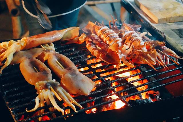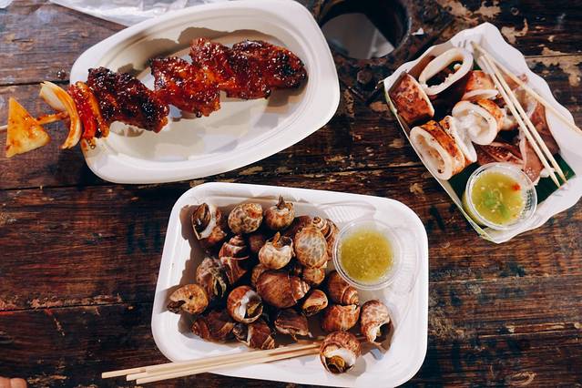 相比较于周六夜市满目玲琅的美食,周日夜市更像是一个多元化的综合性夜市,手工艺品、街头艺人、原创设计、路边足疗、甚至还有移动理发店,当然也少不了FOOD CENTER,里面有好多的海鲜,超大一条的烤鱿鱼不要错过。